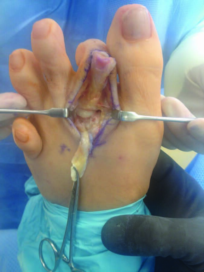 Surgical repairs of acute plantar plate injuries are rare but might be necessary for complete tears with toe dislocation or severe MPJ laxity on dorsal drawer. In such cases, primary repair through a plantar approach has been my go-to technique. I make an “L” incision in the interspace with the “L” portion at the phalanx base transversely. I then open the flexor sheath, and retract the flexor tendon. Then I can primarily repair the plantar plate with non-absorbing suture material. Rarely, suture anchors may be necessary to anchor the plantar plate into the base of the phalanx.