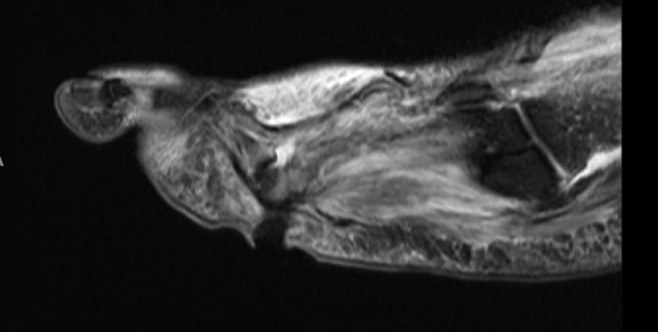 We present an unusual case of a 39-year-old male with poorly controlled type 2 diabetes, and status post-myocardial infarction, who presented to the ED with an infected chronic plantar right foot wound. There was no superficial dermatophytosis noted to the foot. He began empiric IV antibiotics, and a right foot MRI showed osteomyelitis of the bases of the fourth and fifth proximal phalanges as well as the head of the fourth metatarsal. He underwent initial irrigation and debridement of the wound with resection of the infected bone; however, on the first postoperative day he continued to have severe foot edema, erythema, and purulence from the operative foot. Computed tomography (CT) and repeat MRI showed no plantar abscess; however, clinically and intraoperatively noted purulence.