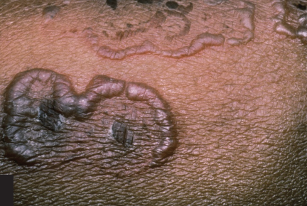 These elongated, annular, and fusiform (or sausage-shaped) blisters are most characteristic of LAD, especially the childhood variant (chronic bullous disease of childhood); they are often referred to as a “cluster of jewels.” The prototypic finding in direct immunofluorescence of perilesional skin is IgA (primarily IgA1 subclass) in continuous, linear, homogenous array along the dermoepidermal junction (not to be confused with the linear granular deposition of IgA seen in rare patients with dermatitis herpetiformis). Infrequently, weaker staining of IgG may also accompany IgA in LAD patients. Circulating IgA antiskin basement membrane autoantibodies are detected in the majority of patients; most of these antibodies bind to the epidermal roof of 1M sodium chloride-split human skin substrate. These autoantibodies react against the 120-kD fragment of an ectodomain of type XVII collagen. A mouse model confirms the pathogenicity of these autoantibodies. Some patients with LAD have lymphoid or nonlymphoid malignancies. A number of drugs have been associated with LAD in adults, most notably vancomycin. Furthermore, there is an association between LAD and the HLA-B8 haplotype.