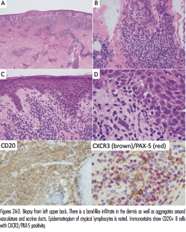 Analysis of a biopsy taken from the back revealed a psoriasiform epidermal hyperplasia accompanied by areas of superficial band-like lymphocytic infiltration with focal infiltration of the epidermis by atypical noncerebriform lymphocytes and plasma cells. A supervening perivascular and perieccrine lymphocytic infiltrate was noted as well. Comprehensive phenotypic studies done revealed that many of the intraepidermal lymphocytes were positive for CXCR3, CD20 but did not express CD5 (Figures 2A-D). There was evidence of lambda light chain restriction amidst the plasma cells. Monoclonality of IgH/IgK were detected via polymerase chain reaction.