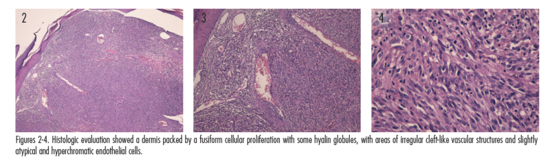 Pyogenic granuloma appears clinically as a dome-shaped lesion bordered by an epidermal collarette, most commonly on the extremities. Histologically, pyogenic granulomas consist of a lobular proliferation of capillary vessels in the dermis. In contrast, KS has a dense proliferation of spindle cells arranged in fascicles that is often associated with an inflammatory cell infiltrate, which is not seen in pyogenic granuloma.4,12 Clinically, pyogenic granuloma is usually a solitary lesion, whereas KS most commonly presents as a group of lesions.