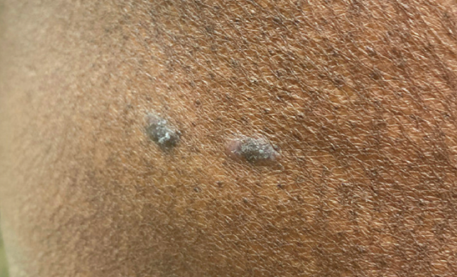 A 50-year-old woman presented to our dermatology clinic in February 2022 for evaluation of scattered, small, pruritic, dark papules present on the upper and lower extremities (Figure 1).