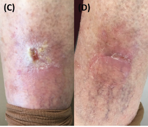 Based on the patient’s personal circumstances, the decision was made to pursue nonsurgical intervention (IL 5-FU injection). Three weeks following initial IL 5-FU treatment, the patient presented with ulceration, er thema, and crusting at the site of injection (Figure 3C). Clinical presentation was consistent with ulceration secondary to IL 5-FU injection, but doxycycline was prescribed prophylactically due to mild tenderness and warmth. Six weeks after the single IL 5-FU injection, the ESA lesion on the anterior leg showed complete response (Figure 3D). In some cases, IL 5-FU treatment can completely resolve idiopathic ESA with a single injection.