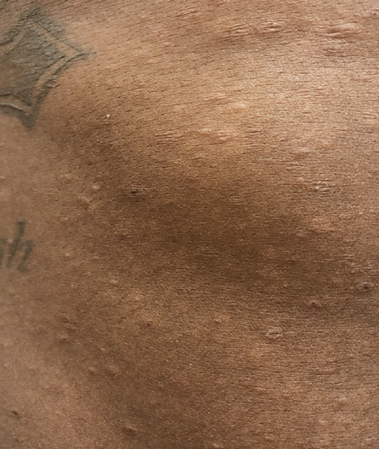 A 21-year-old active-duty Marine presented with diff use nonpruritic, nonpainful hypopigmented macules and thin papules with central necrosis most prominently over the trunk and upper extremities (Figure 1 and Figure 2). His rash began 2 years prior, first developing on his upper extremities then his trunk. At the time of presentation, he was evaluated by his primary care physician and diagnosed with pityriasis versicolor. Topical and oral antifungals were prescribed. The patient had no response to these treatments. Shortly after, he was prescribed oral doxycycline for acne. During this course, he had significant improvement and near resolution of the lesions, which recurred after discontinuing doxycycline. A follow-up biopsy showed interface changes and nonspecific lymphohistiocytic infiltrate. Three syphilis panels were negative. The patient was referred to dermatology for further evaluation.