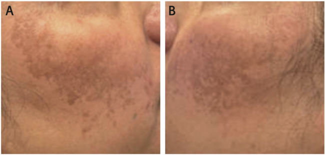 Melasma is a chronic hyperpigmentation disorder presenting as brown patches on sun-exposed areas, primarily the face.1 It commonly affects people with darker skin types (phototype III to V) and women. The disease can have a significant impact on patients’ quality of life and therapeutic management is challenging due to the high rate of recurrence. Reported treatment options include topical hydroquinone, tranexamic acid, microneedling, chemical peels, and laser therapy.2 Of these therapies, laser therapies are associated with increased melasma clearance and reduced Melasma Area and Severity Index scores, but they are still less frequently used than topicals.3 We present a case of melasma in a woman with Fitzpatrick skin type IV who was treated with several sessions of nonablative Alexandrite laser (755 nm).