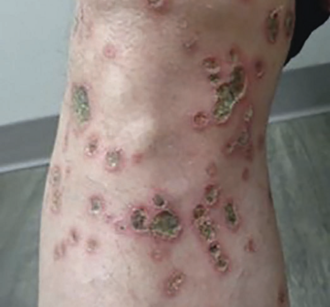 A 66-year-old man with no past medical history presented with a pruritic eruption on the lower extremities of approximately 3 weeks’ duration. The patient endorsed possible chigger bites while working on his farm prior to the appearance of the rash. The lesions started as papules that subsequently became umbilicated. On physical exam, there were numerous umbilicated, crusted papules and plaques with erythematous borders involving the bilateral anterior lower extremities up to the distal thigh (Figure 1).