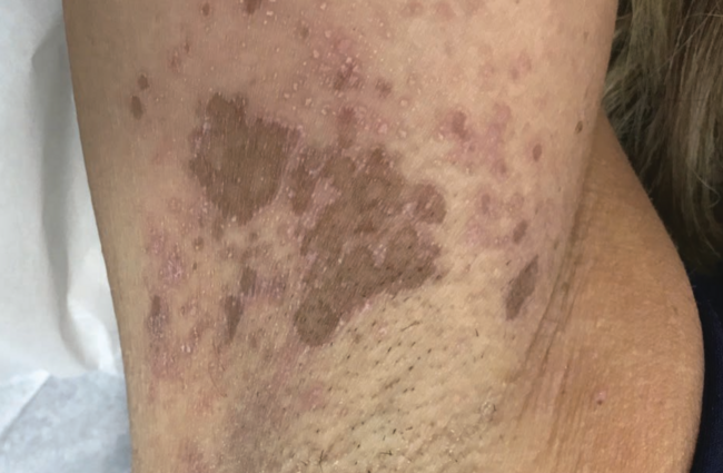 Case ReportAn otherwise healthy 56-year-old White woman presented to the dermatology department for evaluation of a rash to the bilateral axillae, wrists, and inframammary folds. The rash had been worsening over the past 3 months. No pertinent past medical history. Review of systems was negative. Lesions were mildly pruritic. Cutaneous examination revealed multiple hyperpigmented annular and polycyclic macules and patches with an elevated violaceous border in the bilateral axillary (Figure 1) and inframammary folds. In the same regions, the patient also had multiple scattered violaceous, flat-topped papules. On the volar aspects of the wrists, she also had multiple violaceous polygonal flat-topped papules. No nail changes or oral lesions were appreciated.
