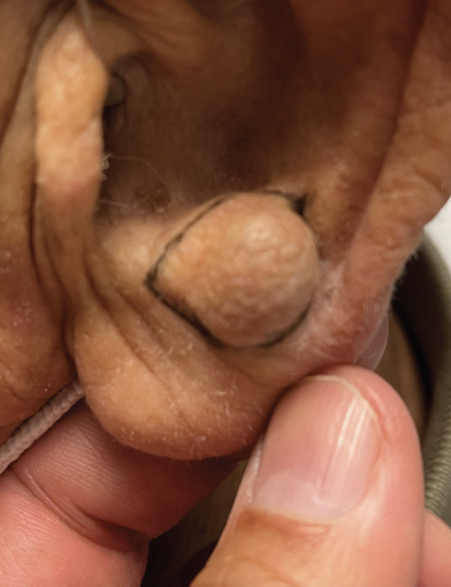 A 90-year-old man with a history of diffuse actinic skin damage and multiple nonmelanoma skin cancers postexcision presented with a painless lesion on his left antitragus. He reported the lesion had grown slowly over the last 2 years. He was bothered by the appearance, prompting him to obtain an evaluation for removal.