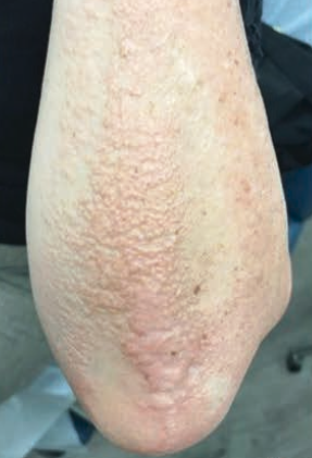 Our patient was a 59-year-old Caucasian woman who presented with a progressive eruption on her arms, ears, shoulders, and legs characterized by localized areas of induration exhibiting a peau d’orange surface change with supervening coalescing papules (Figure 1). The patient stated that the rash was not associated with pain or pruritus. She had occasional right hip pain that was attributed to osteoarthritis. She denied any difficulty swallowing. Her past medical history included hypertension and hypercholesterolemia for which she received lisinopril and atorvastatin.