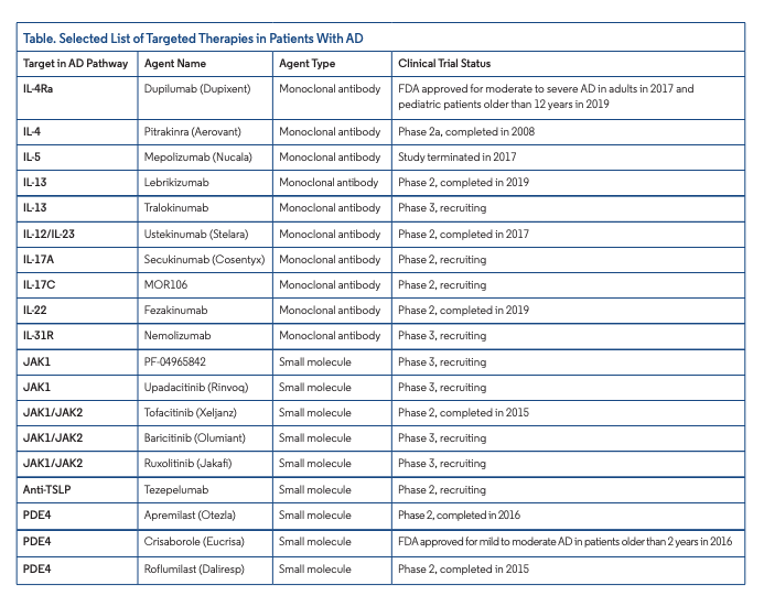 Currently, the only biologic approved in the United States for the treatment of adults and adolescents with moderate to severe AD is dupilumab (Dupixent), an anti-IL4R monoclonal antibody. Dupilumab has a remarkable safety profile and efficacy comparable to immunosuppressive systemic agents. By blocking the IL-4 receptor, this monoclonal antibody interferes with IL-4 and IL-13 functions and with the downstream production of proinflammatory TH2 cytokines and chemokines.5 Besides upregulation of systemic proinflammatory markers, IL-4 and IL-13 have a direct effect on the epidermis, including keratinocyte proliferation and spongiosis. At 16 weeks, skin biopsies obtained from patients treated with dupilumab demonstrated improvement in AD severity by suppression of inflammatory markers and reversal of epidermal changes induced by the disease.7