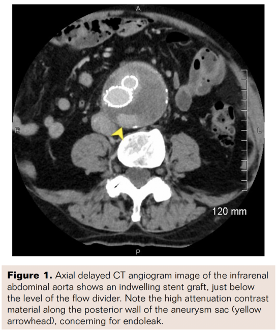 Since the inception of intraluminal stent-graft implantation for abdominal aortic aneurysm exclusion was first described by Parodi et al in 1991, endovascular repair has eclipsed open surgery as the preferred treatment method, now representing 80% of all cases in the United States.1 Despite a clear reduction in perioperative morbidity and mortality between EVAR and open surgical repair, endovascular treatment presents a unique set of potential complications requiring lifelong imaging surveillance.2 Endoleaks are defined as persistent perfusion of the aneurysm sac, representing the most common complication and indication for reintervention following EVAR. Endoleaks are stratified into five categories based on etiology (Table 1). While type I and type III endoleaks are associated with elevated sac pressure and ongoing risk of rupture, the natural history of type II endoleaks can be variable. Type II endoleaks have been reported in up to 25% of patients at the time of index aneurysm repair, of which at least 50% resolve spontaneously.3 The incidence of persistent type II endoleak is reported to be 10-15% at 6 months with variable impact on sac diameter, and new type II endoleaks may develop in 5-10%. Risk factors for persistent type II endoleak include ongoing anticoagulation, a patent IMA, and size and number of patent lumbar arteries.4–6 Although timing and management of secondary interventions for persistent type II endoleaks has sparked controversy in the literature, current SIR, SVS, and CIRSE clinical practice guidelines support intervention for continued sac enlargement, most commonly at 5 mm or more.3,7