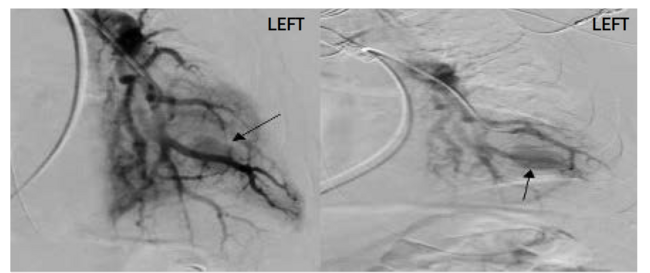 Based on CTA, the interventional radiology (IR) team was consulted, and they performed a pulmonary angiography. A large pseudoaneurysm arising from a left lower lobe segmental pulmonary artery branch was found (Figure 1), and it was successfully embolized (Figure 2).