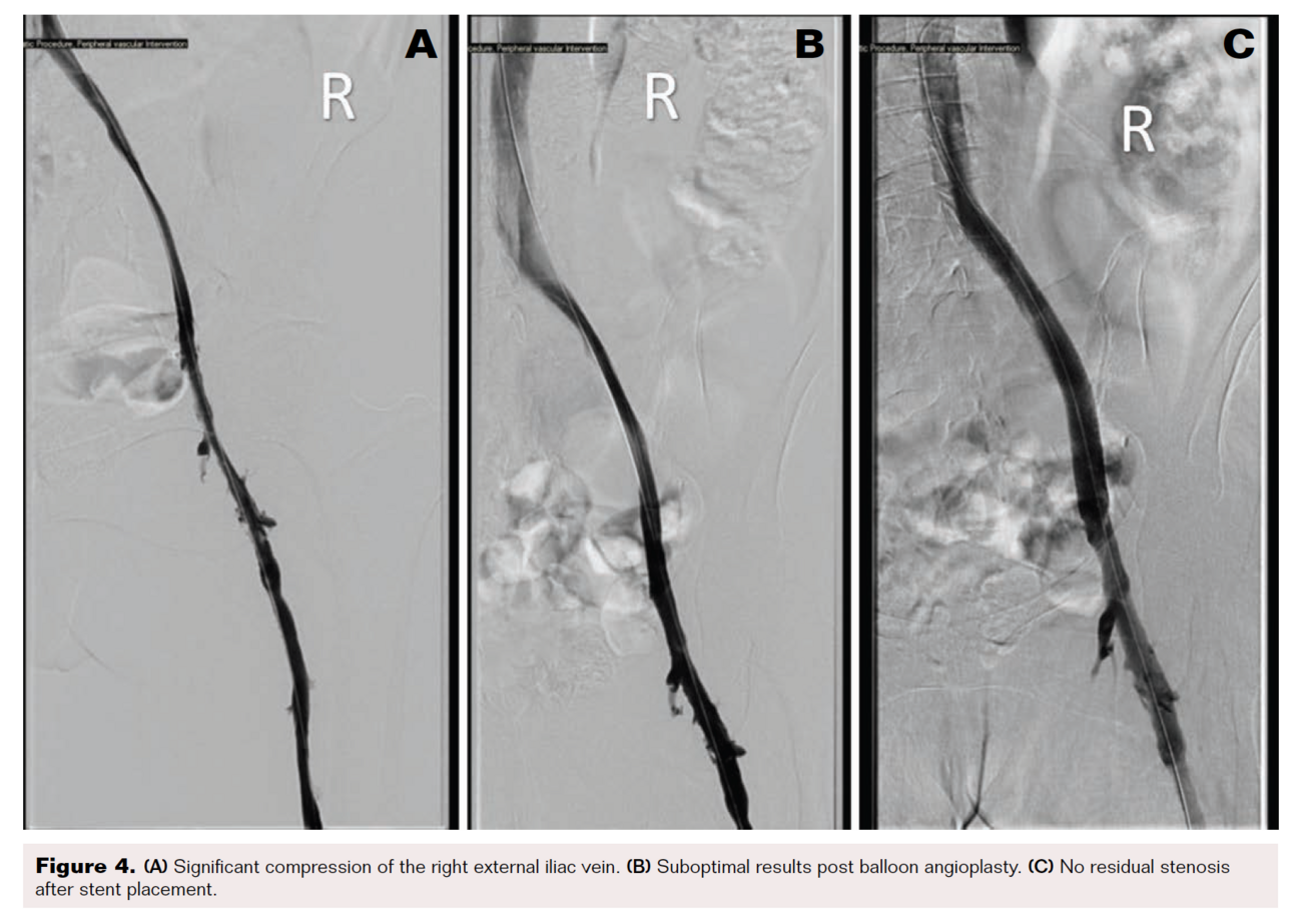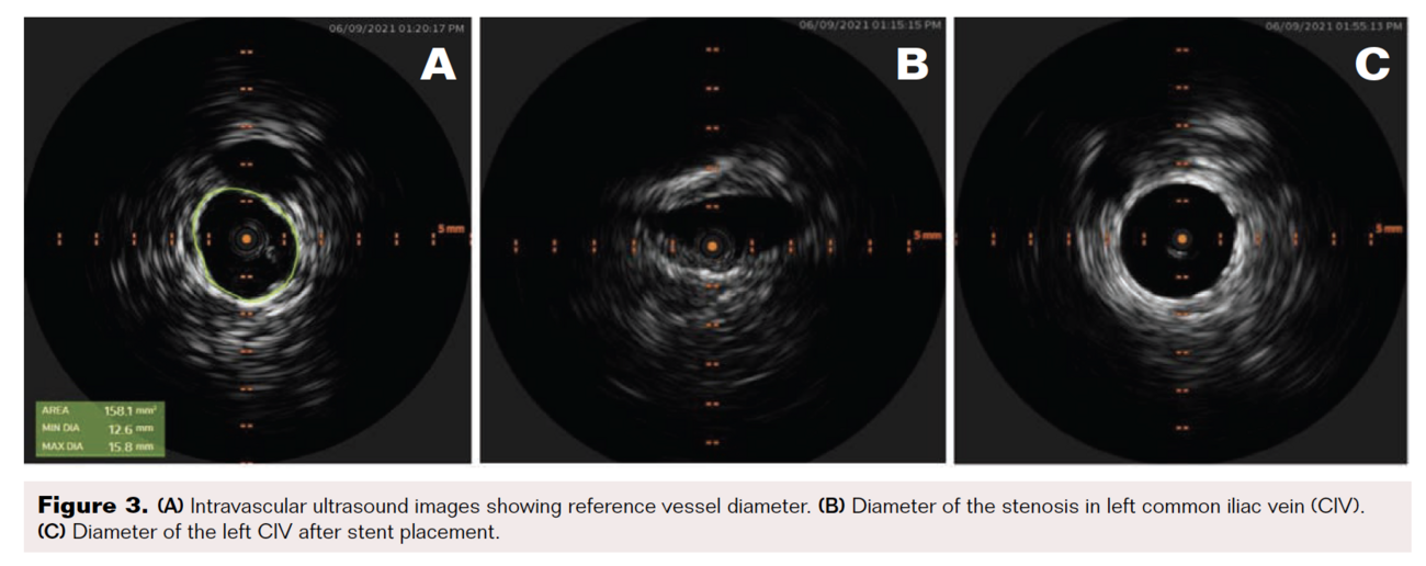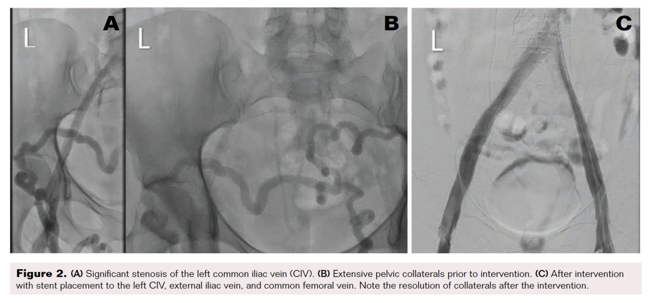 A 39-year-old woman with a history of recurrent deep vein thrombosis (DVT), pulmonary embolism (PE), and protein C deficiency on oral anticoagulation (OAC) was referred to our clinic for chronic bilateral lower extremity swelling, redness, and varicose veins. She was initially diagnosed with DVT and PE in 2003, for which she was on OAC with warfarin. Her warfarin was discontinued 6 months later, and she did well until 2018 when she had a recurrent DVT and PE following an 8-hour plane ride. At that time, a workup revealed a protein C deficiency, and she had been on OAC with apixaban 5 mg twice daily ever since. Her leg swelling, redness, and pain became severe a few weeks before presentation, which was aggravated by standing for long periods. She also complained of frequent dyspareunia and periodic pelvic pain. On physical examination, she was noted to have varicose veins on both legs, 2+ pedal edema up to the level of the thigh, and redness in both legs. We ordered a venous ultrasound (US) of the lower extremity to assess for reflux and to rule out DVT. We ordered a magnetic resonance angiography (MRA) with the suspicion of a central venous obstruction and PCS. Her US showed a chronic, nonocclusive thrombus in the left common femoral vein (CFV). Her MRA showed effacement of the proximal left iliac vein by the right common iliac artery, which was consistent with May-Thurner syndrome (Figure 1). In addition, the MRA showed varices of the anterior pelvic wall. We performed venography with intravascular US (IVUS)-guided percutaneous transluminal angioplasty (PTA) and stent placement. US-guided access was obtained from both right and left popliteal veins, and 8 Fr sheaths were inserted. Contrast venography was performed to both the deep femoral and iliac veins, demonstrating vessel patency throughout with visually apparent luminal narrowing in the left iliac vein. IVUS confirmed a 40% compression of the right external iliac vein (EIV) and a diffuse 80% fibrotic stenosis of the left common iliac vein (CIV) to CFV (Figure 2A). Extensive pelvic collaterals were also noted (Figure 2B). We performed PTA of the left CIV with a 16 mm x 40 mm Atlas Gold balloon (BD). Following balloon angioplasty, through the 8 Fr sheath, we deployed a 16 x 140 mm Zilver Vena stent from the left CIV into the EIV and deployed another 16 x 60 mm Zilver Vena stent overlapping with the first stent from the EIV into the CFV. The stents were post-dilated with the same Atlas Gold balloon, and a postprocedure venogram and IVUS showed excellent results, with complete resolution of the pelvic collaterals (Figure 2C). She was discharged home on clopidogrel 75 mg daily in addition to the apixaban 5 mg twice daily that she was already on. On a follow-up visit 1 month later, the patient reported significant reduction of her lower extremity edema, pain, and redness. On a 6-month follow-up, she reported complete resolution of these symptoms as well as pelvic pain and dyspareunia.
