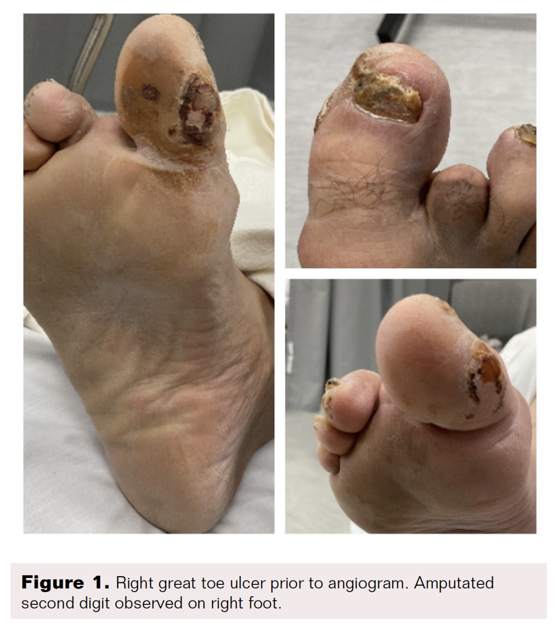 A 48-year-old Hispanic man with a 20-year history of insulin-dependent type 2 diabetes mellitus presented in the clinic with a longer than 2-month history of a right hallux plantar ulceration (Figure 1). Hemoglobin A1c was 16.3%, with an estimated average glucose of 421 mg/dL. The patient did not have a history of hypertension (HTN) or hyperlipidemia (HLD) but was a former smoker with a 60 pack-year history, having quit 10 years ago. The patient had also previously undergone a right second-toe amputation in 2019 for presumed gangrene that had no healing complications (Figure 1). The patient denied any prior revascularization procedures.