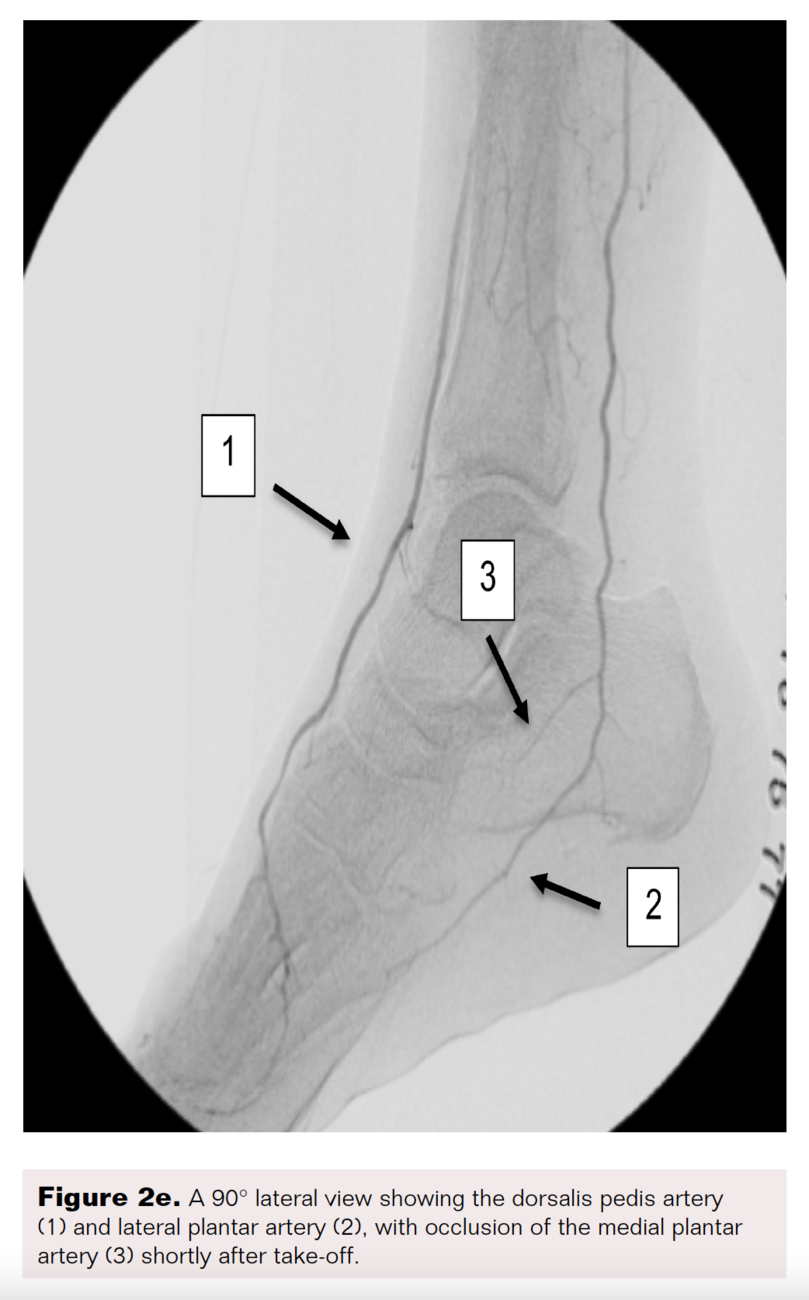 However, the entirety of the medial plantar artery (MPA) distribution was chronically occluded shortly after take-off (Figure 2E and Figure 2F). Super-selective angiography revealed chronic total occlusion of the medial branch of the first common plantar digital artery arising from the first plantar metatarsal artery (Figure 2G). Angiography also revealed an occluded accessory branch arising medially from the superficial branch of the MPA.