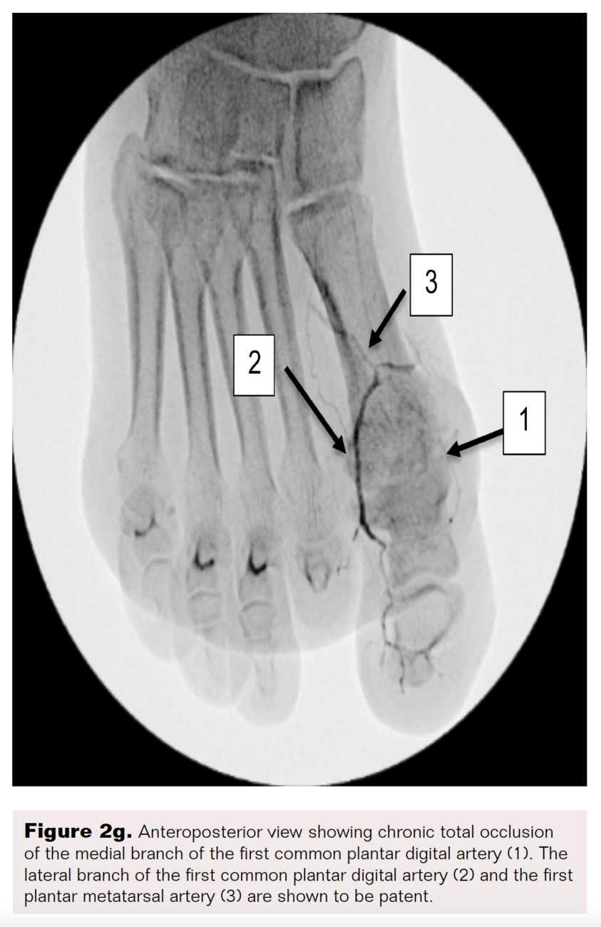 Critical limb ischemia (CLI) resulting from peripheral artery disease (PAD) affects more than 2 million individuals in the United States, with diabetic patients more at risk for inframalleolar arterial disease.1 Unfortunately, interventions below the ankle are rare, with digital interventions being even less common. Here, we present the case of a patient with chronic total occlusions of the arteries supplying the right hallux and the effects of revascularization in the region.