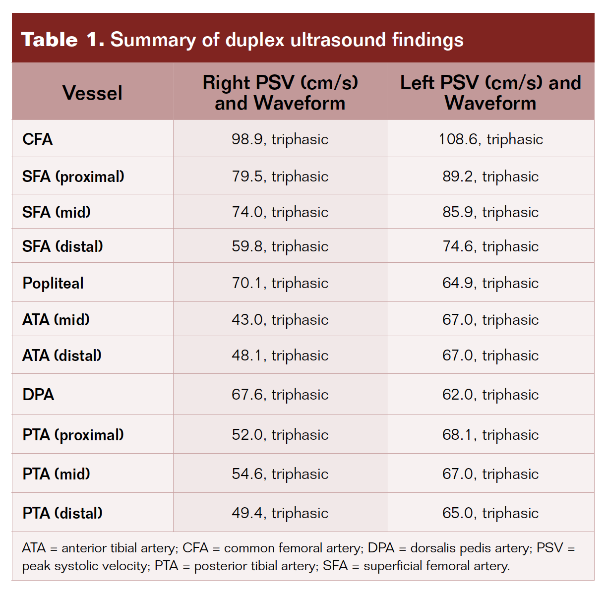 Physical examination demonstrated severe peripheral neuropathy with loss of sensation up to the mid leg. Arterial duplex ultrasound showed triphasic waveforms bilaterally with no significant stenosis from the common femoral to the dorsalis pedis artery (DPA) (Table 1). Peripheral pulses were easily palpable in the DPA and weakly palpable in the posterior tibial artery (PTA). Given the chronicity of the wound and ischemic ulcer base, an angiogram with possible intervention was recommended.