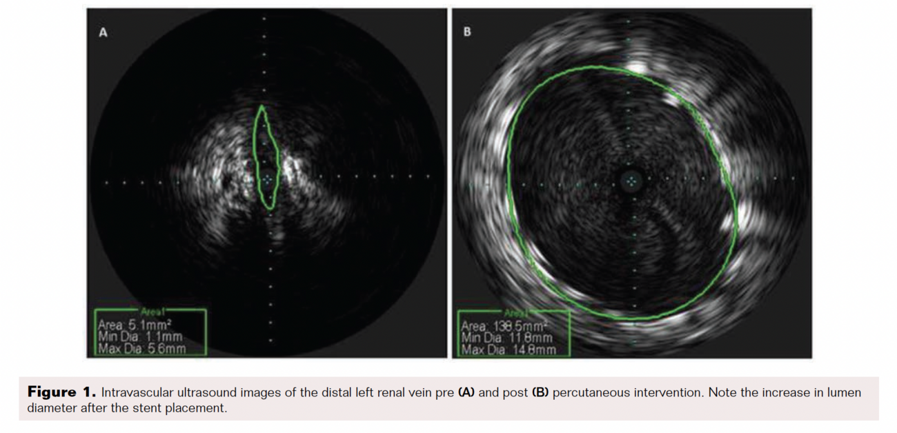 A 34-year-old woman with a history of hypotension, anemia, and asthma was referred to the cardiology clinic for evaluation of pelvic congestion syndrome (PCS). She reported longstanding constant, diffuse, progressively worsening, dull, aching pelvic and lower abdominal pain, exacerbated by exertion and sexual intercourse, for almost 2 years. She was amenorrheic and taking depot medroxyprogesterone for the past 2 years. Physical exam was significant for normal vital signs and tenderness over the lower abdominal quadrants, bilateral levator, and lumbar spine. Labs were significant for hemoglobin (10.7 mg/dL), hematocrit (33.4%), and microscopic hematuria. Computed tomography (CT) scan of the abdomen and pelvis with contrast was significant for mild right-sided hydronephrosis and a 3 mm right distal ureteral calculus. Transabdominal and transvaginal pelvic ultrasound showed prominent pelvic vasculature with a small amount of free pelvic fluid, suggestive of PCS. Inferior vena cava (IVC) venography and renal vein angiography with intravascular ultrasound (IVUS) was performed with a high suspicion for nutcracker syndrome (Figure 1). It revealed a normal IVC, a dilated proximal left renal vein (LRV) and gonadal vein with varicose veins, and a complete obliteration of the lumen from the mid to distal LRV adjacent to the superior mesenteric artery (SMA). Balloon angioplasty with an 8.0 balloon and self-expanding 14 x 4 cm stent was placed in the LRV, overlapping with another 6 x 4 cm stent. IVUS after stent placement revealed the dimension of the LRV to be 40 mm, with no compression at the end of the procedure. The patient was started on aspirin and clopidogrel and was followed up in clinic.