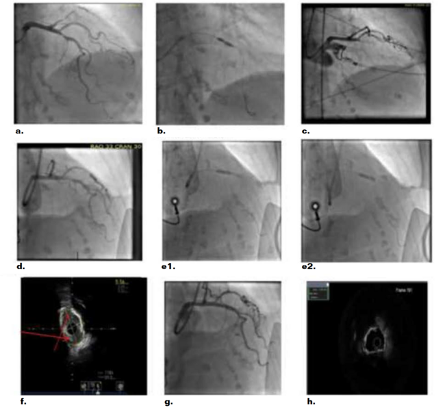 A workhorse wire was advanced and crossed the lesion, and TIMI 3 flow was restored immediately consistent with transient thrombus. A compliant balloon (2.5 mm) was used with continued residual waist. There was evidence of edge dissection just proximal to the lesion (Figure 1d). The patient was started on a glycoprotein IIb/IIIa inhibitor (tirofiban). Atherectomy was contraindicated because of the risk of extending the dissection and the high chance for distal embolization with the presence of thrombus. A 3.5-mm x 12-mm Shockwave balloon was advanced as a last resort and was wedged into the proximal portion of the plaque. Three sets of 10 pulses were delivered with inflation to 4 ATM, and each time the balloon was advanced gradually into the lesion until total crossing of the lesion (Figure 1e1 and Figure 1e2). Following lithotripsy, the lesion was dilated with a 3.5-mm x 12-mm NC balloon at 12 ATM with full balloon expansion. Intravascular ultrasound (IVUS) post Shockwave lithotripsy showed fractured calcium in 2 different areas (Figure 1f) . A 3.5-mm x 24-mm Synergy stent was deployed and inflated up to 16 mm ATM, then post dilated with a 4.0 x 8 NC Emerge balloon at 16 ATM with no residual narrowing (Figure 1g). Post stent IVUS showed a minimal stent area of 9 mm2 (Figure 1h) with good opposition and expansion of the stent.