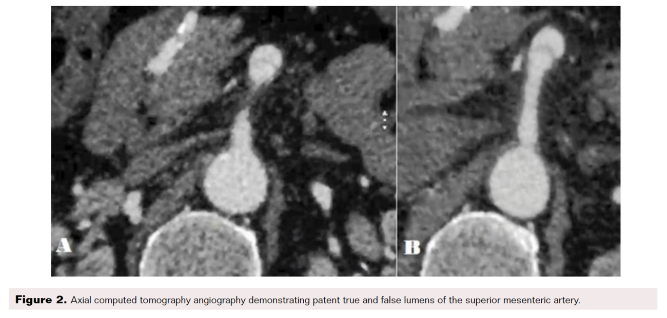 A 56-year-old male with a history of coronary artery disease who had undergone a prior cardiac catheterization with stent placement presented to our emergency department with a chief complaint of diffuse, progressively worsening, postprandial abdominal pain onset 6 hours earlier. A CTA was obtained, revealing an isolated superior mesenteric artery (SMA) dissection (Figure 1 and Figure 2). Vascular surgery was immediately consulted, and the patient was placed on a heparin infusion and transferred to our tertiary care facility. Upon examination, the patient had the typical out-of-proportion pain as seen with AMI, but he lacked any systemic signs of inflammation. Additionally, his vital signs and laboratory studies were all within normal limits. CTA findings revealed a dissected SMA with patent true and distally thrombosed false lumens without any evidence of bowel ischemia. Considering the patient’s presentation, physical examination, and imaging findings, admission was pursued for serial abdominal examinations, bowel rest, and anticoagulation with therapeutic heparin.