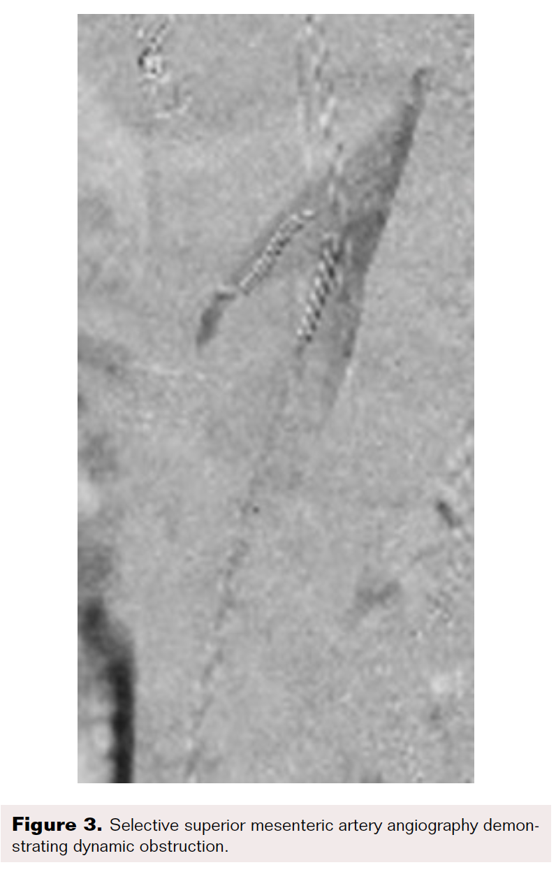 Over the next 36 hours, the patient’s abdominal pain persisted; however, he did not develop any leukocytosis, lactic acidosis, tachycardia, or fever. Due to the patient’s refractory pain, despite objective evidence of bowel ischemia, we performed a repeat CTA, which did not reveal any new findings. A decision was made to proceed with angiography to better define the dynamics of his SMA dissection and potentially intervene on an endovascular basis. Although CTA demonstrated a patent true lumen, on selective mesenteric angiography there was dynamic obstruction of the distal SMA from the thrombosed false lumen (Figure 3). Given the potential risks of an endovascular approach and the need to deploy a long stent to treat the dissected SMA, a decision was made to proceed with open surgical repair.
