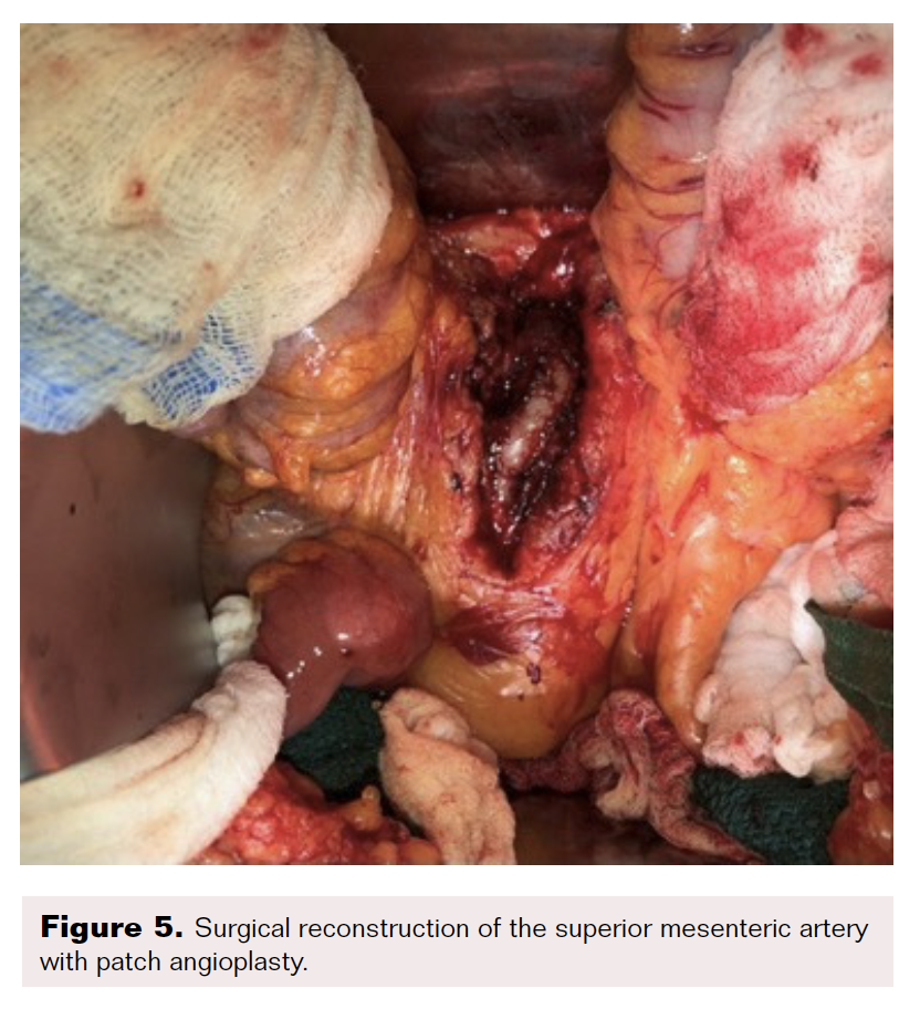 A midline, exploratory laparotomy was performed, which revealed a healthy, well-perfused bowel. After reflection of the transverse colon superiorly, the root of the mesentery was opened and the SMA was meticulously skeletonized. The patient was systemically heparinized, a Fogarty clamp was applied to the proximal SMA, and vessel loops were tightened around branch vessels and the distal SMA (Figure 4). A longitudinal arteriotomy was subsequently made in the SMA and the thrombosed false lumen was encountered. Intimectomy was performed and the septum was resected to create a large fenestration between the true and false lumen distally. The intima was tacked up proximally and the arteriotomy was closed with a bovine pericardial patch. Clamps were removed and flow was restored as confirmed by both palpation and pencil Doppler (Figure 5).