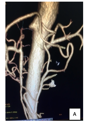 A middle-aged man presented with classical postprandial pain and weight loss. CT of the abdomen showed chronic total occlusion (CTO) of the SMA with occlusion of the CA and stenosis of the IMA (Figures 2A, 2B, and 2C). Via the left brachial artery, coaxial assembly of a 6F long sheath and 5F multipurpose catheter was taken in the suprarenal aorta. The lesion was crossed with a 0.035" straight-tip hydrophilic Glidewire (Terumo), predilated with a 6 mm angioplasty balloon and stented with 7mm x 27 mm VIsi-Pro balloon-expandable stent (Medtronic) (Figures 2D, 2E, and 2F).