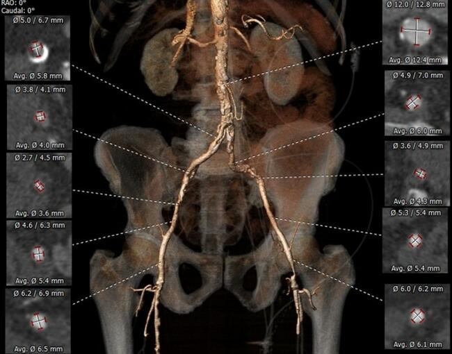 Computed tomography revealed peripheral arterial obstructive disease in his lower limb arteries. Minimal diameter of the right femoral artery was 6.2 mm; external iliac artery (EIA), 2.7 mm; and common iliac artery (CIA), 5 mm. Minimal diameter of the left femoral artery was 6 mm; EIA, 3.6 mm; and CIA, 4.9 mm (Figure 1).
