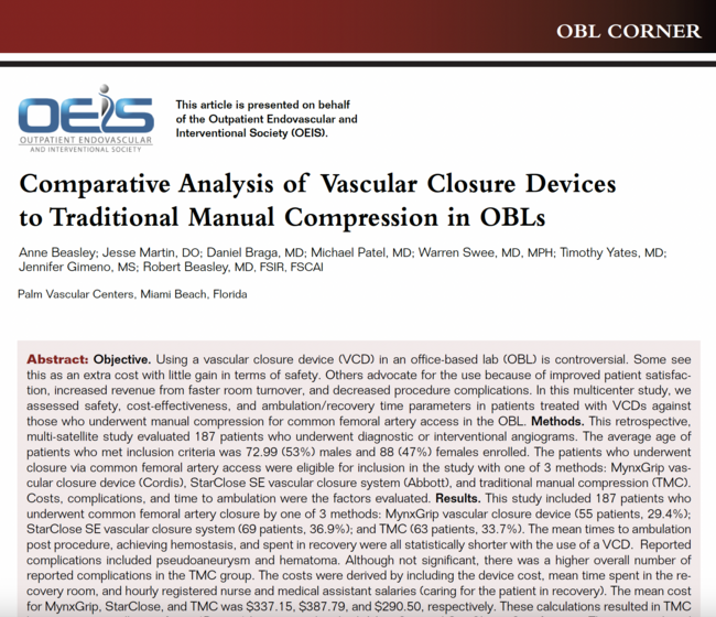 In our study, the mean time to hemostasis, ambulation, and time spent in recovery was significantly shorter than patients treated with TMC, which is in accordance with multiple previously done studies. Due to the retrospective nature of this study, we were unable to evaluate patient satisfaction. However, numerous other studies have shown improved patient satisfaction with VCDs related to ambulation time and time spent in recovery.1 Regarding an OBL, some would argue that improved patient satisfaction is even more important than with a procedure done in a hospital setting because OBLs rely on physician referrals and patients making the conscious decision to return to the OBL for continued care. Interventionalists in OBLs need to consider this when deciding on VCD use.