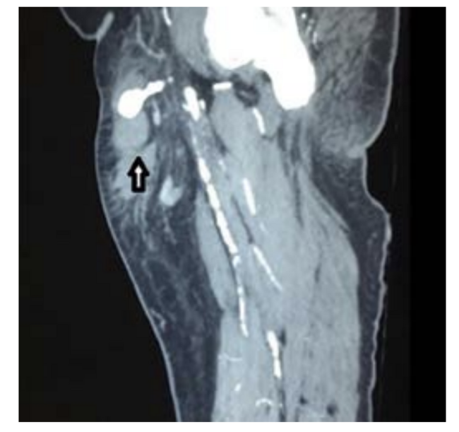 On the ultrasound arterial doppler a heterogeneously hyperechoic area was found at the upper part of the right thigh, with skin discoloration suggestive of a hematoma. This had a well-defined echogenic area with a Ying and Yang color flow, and swirling suggestive of a pseudoaneurysm. This appeared to arise from the common femoral artery (Figure 1). Since the swelling was very large, to enable further treatment decisions we sent the patient for a CT angiography of the thigh (Figures 2-5).