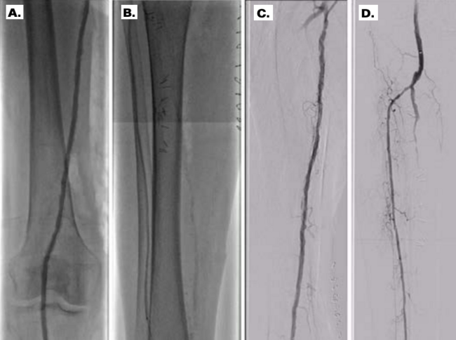 A 93-year-old woman with history of hypertension, permanent atrial fibrillation, prior cigarette smoking, chronic stage 3 kidney disease, and moderate aortic stenosis, presented to an outside hospital with disabling rest pain, discoloration and swelling of her right lower extremity. Physical examination revealed pale and cool right foot, absent dorsalis pedis and faint posterior tibial pulses, and gangrenous changes involving her second and third toes (Figure 1A). An urgent peripheral angiogram showed severely calcified, diffusely diseased superficial femoral artery (SFA) with CTO in the mid SFA segment, a second CTO in the distal popliteal artery, an occluded peroneal artery, densely calcified and diffusely diseased anterior tibial artery, and a patent but calcified posterior tibial artery with minimal antegrade flow.
