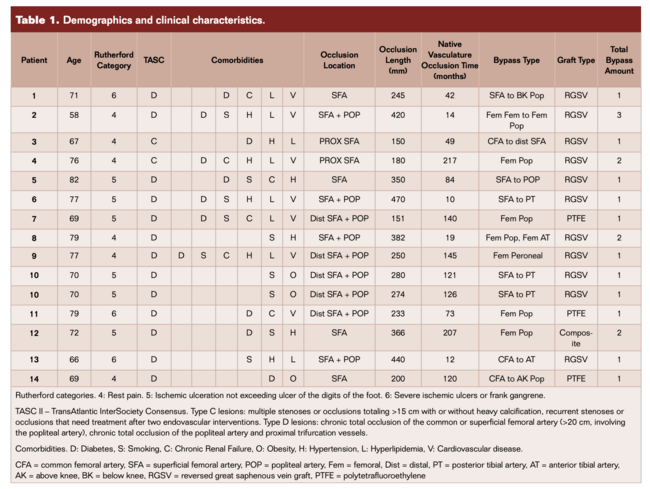 Data collected included patient demographics, comorbidities, Rutherford category and TASC classification, number and type of bypasses, and time from occlusion to recanalization. Reintervention rates and need for major amputation were also recorded.