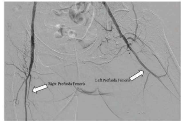 In the present case, procedural success — defined by stenosis reduction and distal reperfusion of bilateral stumps — was dependent upon gaining arterial access through exotic techniques and crossing the CTOs. The occluded common femoral arteries prevented successful retrograde or antegrade attempts for arterial access, and the occluded SFAs made direct SFA arterial access not feasible. An exotic brachial-profunda approach was needed to achieve access to the diseased segments. As a result of the successful PTA and stenting procedures, the patient no longer presents with ischemic rest pain and has significantly reduced reliance on opioids to control pain.