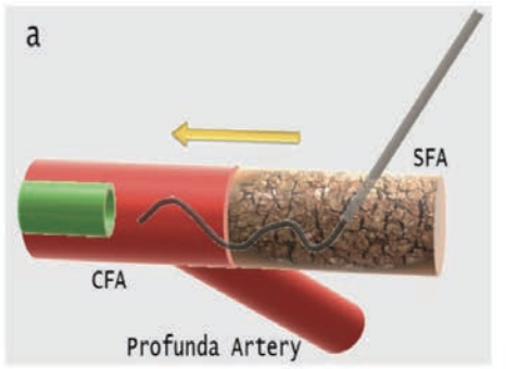 In other cases, we have been able to work through the SFA without needing pedal access. This technique may be restricted to patients who are not of large body habitus, which limits both adequate visualization of the vessel and on occasion, the reach of the micropuncture needle. Particularly in short SFA occlusions or in patients with severe infrapopliteal artery disease where pedal access may not be an option, this approach is an alternative that can be performed easily and quickly, as well as ensure "flush" SFA occlusion proximal cap intraluminal access. This approach can serve as an adjunct in cases in which crossing the proximal cap antegrade or retrograde via pedal access is difficult, and it can also shorten the interventional time.