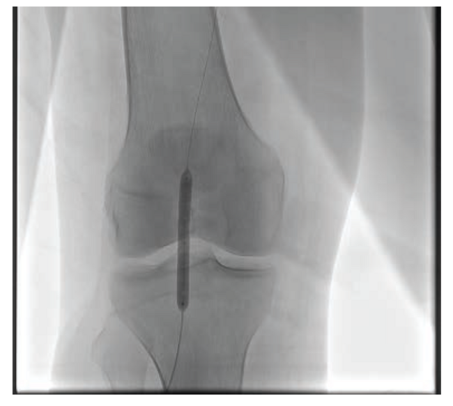 I recently treated a patient with nonhealing ulceration of his right great toe. He had a severely calcified lesion in his popliteal artery, as demonstrated in Figure 1. Due to the calcification, I performed intravascular lithotripsy with a 5.5 mm × 60 mm balloon (Figure 2). After balloon inflation, the lesion had a residual type C dissection (Figure 3). Therefore, I placed 3 tack devices across the area of dissection (Figure 4). Final angiography demonstrated no residual dissection or recoil (Figure 5).