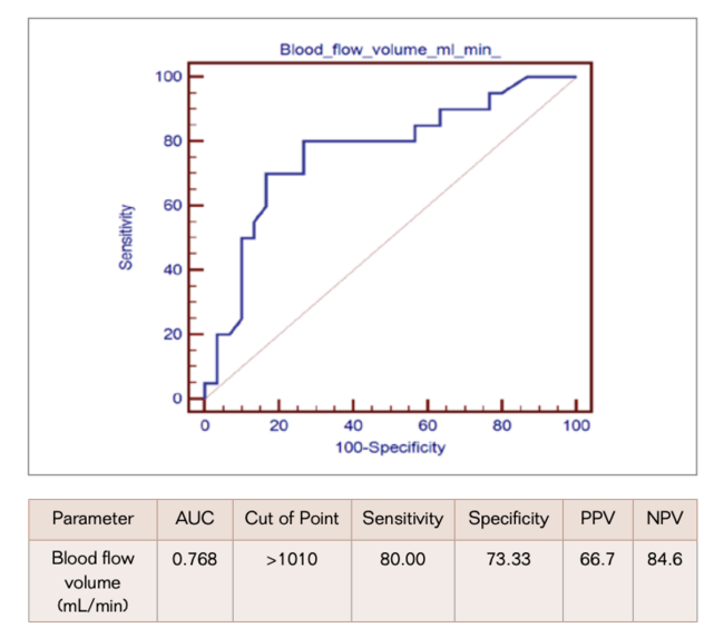 In a roc curve made to find the cut-off value of the blood flow volume that above which the LVEDD is affected, a value of 1010 mL/min or above was found to affect the LVEDD with specificity of 73.3% and sensitivity of 80%.