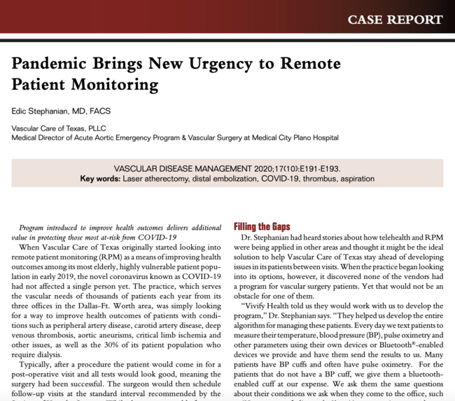 When Vascular Care of Texas originally started looking into remote patient monitoring (RPM) as a means of improving health outcomes among its most elderly, highly vulnerable patient population in early 2019, the novel coronavirus known as COVID-19 had not affected a single person yet. The practice, which serves the vascular needs of thousands of patients each year from its three offices in the Dallas-Ft. Worth area, was simply looking for a way to improve health outcomes of patients with conditions such as peripheral artery disease, carotid artery disease, deep venous thrombosis, aortic aneurisms, critical limb ischemia and other issues, as well as the 30% of its patient population who require dialysis.