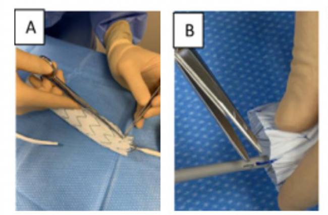 Institutions have developed various iterations of modifying off-the-shelf endografts in use for complex AAAs and TAAAs. Generally, the endograft is constructed preoperatively on a sterile back table. In urgent or emergent scenarios, this can be performed as the patient is being positioned and anesthesia is induced. The graft is unsheathed, and diameter reducing sutures and fixation wires are removed. Once deployed, the fenestrations are marked and precisely measured using a previously designed procedure map. Low-energy heat cautery is used to create the fenestrations, which are then reinforced by circumferentially suturing a radiopaque wire to each fenestration. If creating branched fenestrations, 6-mm or 8-mm Viabahn stent grafts (Gore) can be sutured at the sight of fenestrations to form 1-cm to 2-cm branch arm cuffs.19,20 The modification and resheathing techniques used at our institution are detailed in Figure 2 and Figure 3.20