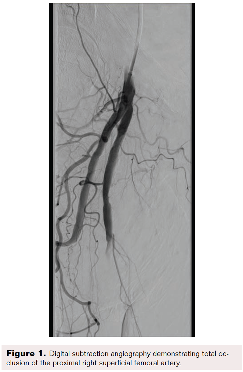 A 70-year-old man was referred for consideration of right lower extremity (RLE) intervention after initially presenting with resting ischemic pain and early tissue necrosis of the metatarsals, consistent with critical RLE ischemia. The patient was taken to the catheterization lab, where contralateral left common femoral artery (CFA) access was gained using a Micropuncture needle (Cook Medical) under ultrasound guidance. A 6F, 11 cm arterial sheath was placed into the artery over a guidewire. The right common iliac artery was engaged using a 5F internal mammary artery catheter; a 0.035" stiff-angled Glidewire (Terumo Interventional Systems) was then advanced to the right CFA. Peripheral angiography of the RLE was performed, demonstrating a total occlusion of the superficial femoral artery (SFA) as well as total occlusion of the popliteal artery and all three infrapopliteal vessels (Figure 1 and Figure 2). The 6F sheath was then exchanged over the Glidewire for a 6F, 45 cm sheath. At this time, anticoagulation was initiated with intravenous unfractionated heparin at 80 units/kg to achieve an activated clotting time (ACT) > 250 seconds.