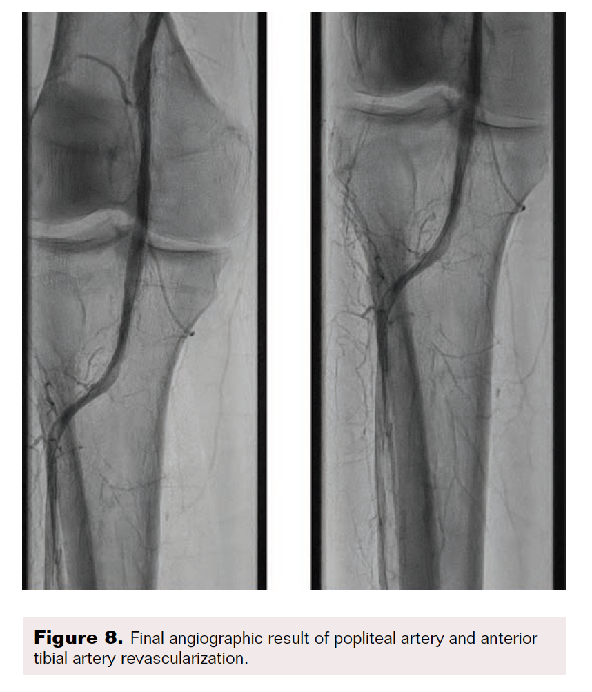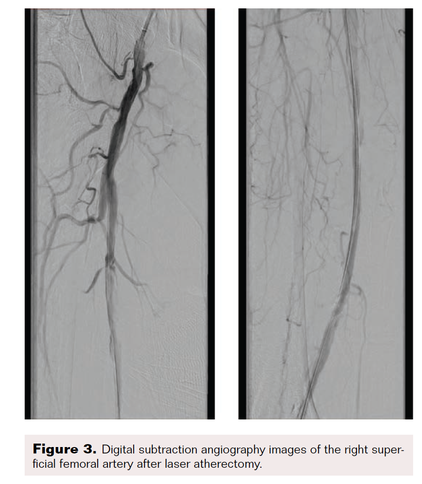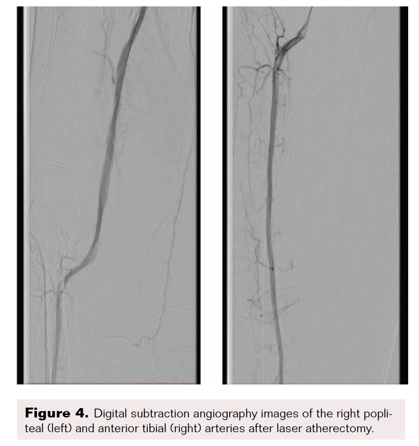 Maintaining an intraluminal course throughout, the SFA and popliteal arteries were successfully traversed using a stiff-angled Glidewire inside of a 0.035" Crosswalk braided peripheral microcatheter (Asahi Intecc Medical) for additional support. After advancing the microcatheter to the distal popliteal artery, the Glidewire was exchanged for a 0.014" pre-curved Mongo ES wire (Asahi Intecc Medical). The occluded anterior tibial artery was successfully navigated with the Mongo wire, after which intravascular ultrasound was performed from the anterior tibial artery proximally to the SFA. Next, laser atherectomy of the SFA, popliteal, and anterior tibial arteries was performed with a 1.7 mm Turbo-Elite laser atherectomy catheter (Philips) (Figure 3 and Figure 4). Following atherectomy, the anterior tibial artery was dilated with an Ultraverse 3.5 x 100 mm balloon (Bard). In preparation for percutaneous transluminal angioplasty of the SFA and popliteal arteries, the Mongo 0.014" wire was exchanged for a 0.035" stiff-angled Glidewire.