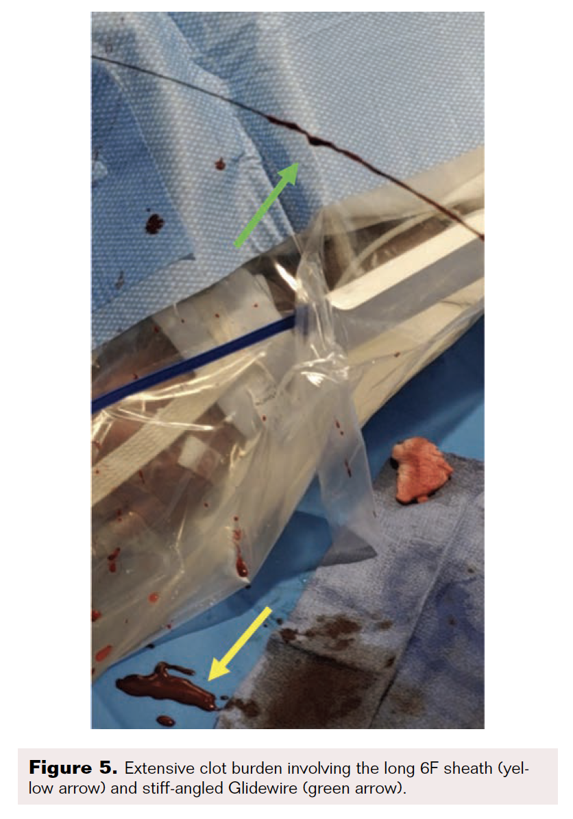 Prevention is the most effective strategy in the management of thromboembolic complications.4 Technological advancements, including heparin-coated catheters and the advent of hydrophilic-coated sheaths as well as guidewires, have been created to decrease the risk of thromboembolic complications. Despite these novel improvements, however, such equipment still retains varying inherent thrombogenicity.6 The easiest method to prevent thrombus formation is frequent flushing of sheaths and catheters with heparinized saline. There is no definitive algorithm to the timing or frequency of sheath flushing. However, multiple resources have suggested the following criteria for when to flush a sheath: after initial insertion, with each catheter exchange, after prolonged idle procedural time, and prior to sheath removal.7-8 Additional management practices to decrease the risk of thrombus formation include ensuring appropriate anticoagulation status, frequent wiping of wires with gauze, or submerging hydrophilic wires in bowls or wire holders filled with heparinized saline.