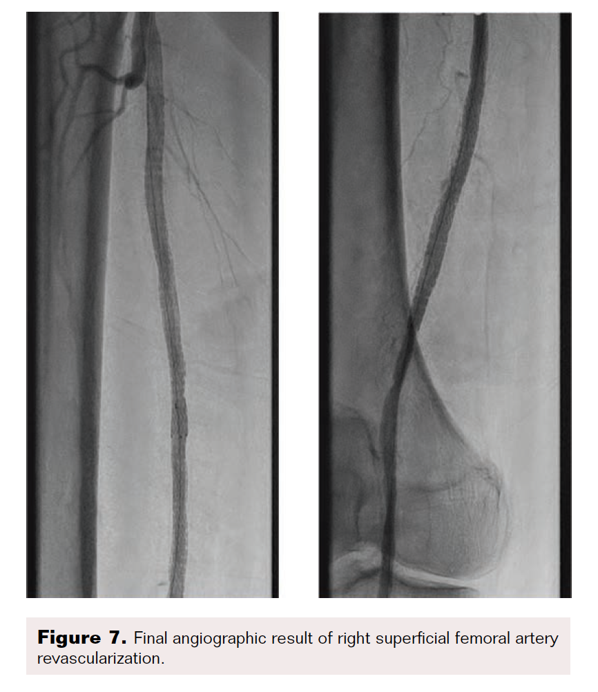 After the wire exchange, we attempted to aspirate, then flush, the 6F sheath with heparinized saline. After multiple failed attempts at sheath aspiration, we suspected a clotted arterial sheath and immediately proceeded to sheath exchange with a new 6F 45 cm sheath. Cautious to maintain wire position, the sheath was successfully exchanged. Saline flushing of the removed sheath resulted in expulsion of extensive clot burden (Figure 5). Repeat ACT confirmed therapeutic anticoagulation. The procedure concluded with percutaneous transluminal angioplasty followed by stenting of the SFA with BioMimics 6 x 150 mm stents (Figure 6). Final angiography demonstrated brisk flow through the SFA, popliteal, and anterior tibial arteries with no evidence of distal embolization (Figure 7 and Figure 8).