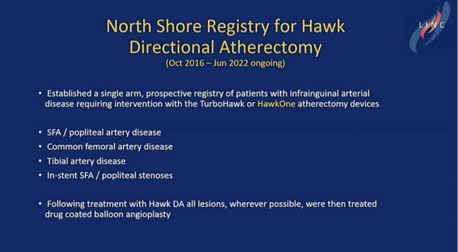 On Monday, June 6, during a session that focused on novel approaches and insights for treatment of complex femoropopliteal disease, Dr. Vikram Puttaswamy, from Sydney Vascular Surgery in Australia, spoke to attendees about the results of a 3-year study on directional atherectomy and drug-coated balloons. “I have been performing vascular surgical procedures for 20 years in a teaching hospital setting in Sydney,” he began. “By 2016, I was using paclitaxel-based treatments as they had a clear advantage over their alternatives.” However, many of his patients were having regular reinterventions and critical limb ischemia (CLI) patients were requiring major amputations on a regular basis. At that time, atherectomy was just coming into use in Australia, and Dr. Puttaswamy wondered which system to use and how best to use it.
