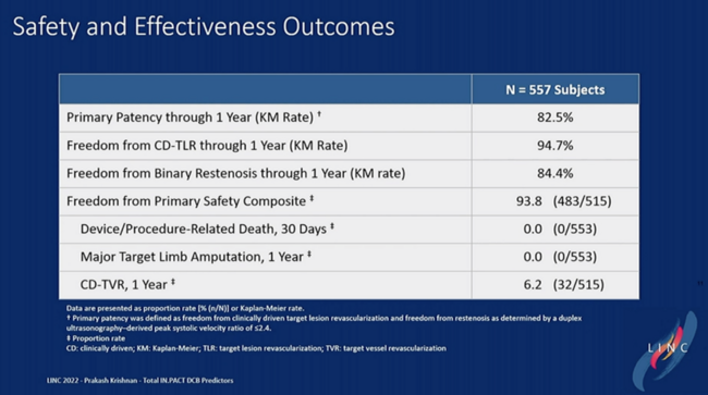 The safety and effectiveness outcomes showed a primary patency through 1 year rate of 82.5%, a freedom from clinically driven target lesion revascularization (CD-TLR) through 1 year rate of 94.7%, and a freedom from binary restenosis through 1 year rate of 84.4%. There were no device/procedure-related deaths after 30 days or major target limb amputations after 1 year. “The predictors that we found of CD-TLR were residual stenosis greater than 30% and Rutherford class greater than 3,” Dr. Krishnan stated. “As far as binary restenosis, it was very clear that residual stenosis was the clear predictor of binary restenosis. And when you look at primary patency failure, the clear predictor was residual stenosis of less than 30%.” Interestingly, the presence of both risk factors increased the risk of CD-TLR and binary restenosis.