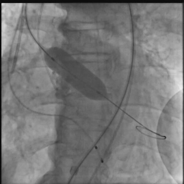 The patient was taken up for TAVR via a left common femoral artery (CFA) approach. The aortic valve was crossed (Figure 1A), and pre-dilatation was done using an 18-mm x 40-mm Mammoth balloon catheter (Meril Life Sciences) (Figure 1B). A 24.5-mm Myval transaortic valve (Meril Life Sciences) was introduced inside a Python expandable introducer sheath (Meril Life Sciences). However, the device could not be negotiated in the distal external iliac artery (EIA) due to calcium. The arrow in Figure 2A shows calcium in the distal EIA. The artery forceps depicts a marker for the distal end of the Python sheath. The sheath was withdrawn in the distal EIA; right CFA puncture was done and a 7F crossover sheath was placed. Intravascular lithotripsy (IVL) was done using a 7-mm x 60-mm IVL balloon; 30 pulses at 4 atm followed by 30 pulses at 6 atm were given (Figure 2B).