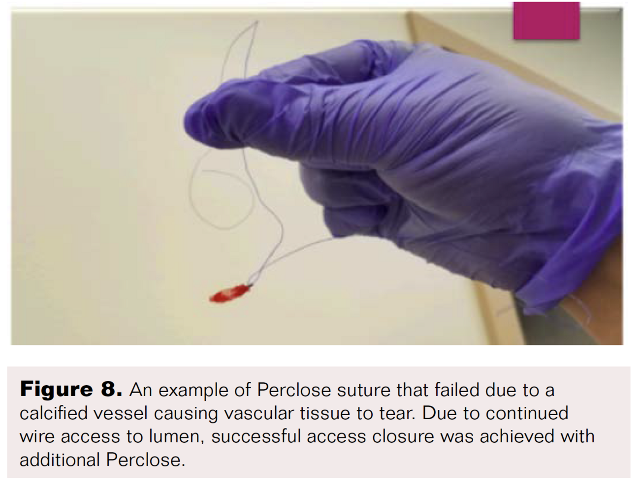 In the hospital, major and minor access complications were monitored in all patients. Time to ambulation post procedure, duration of hospital stay, and early readmissions were also monitored. Due to a controlled wire supported step-down technique, we were able to achieve access closure with a single Perclose suture in some cases where fibro-calcific femoral disease limited Perclose deliverability. Additional MYNX extravascular plugs can be used for optimizing hemostasis in single Perclose cases as shown in Figure 7. This is particularly useful in fibrocalcific ASVD patients where placing Perclose sutures is challenging. Figure 8 is an example of one such case where we saw tissue dehiscence with Perclose. Because of continued wire access to vessel lumen, we were able to reintroduce a second Perclose suture and complete successful access closure.