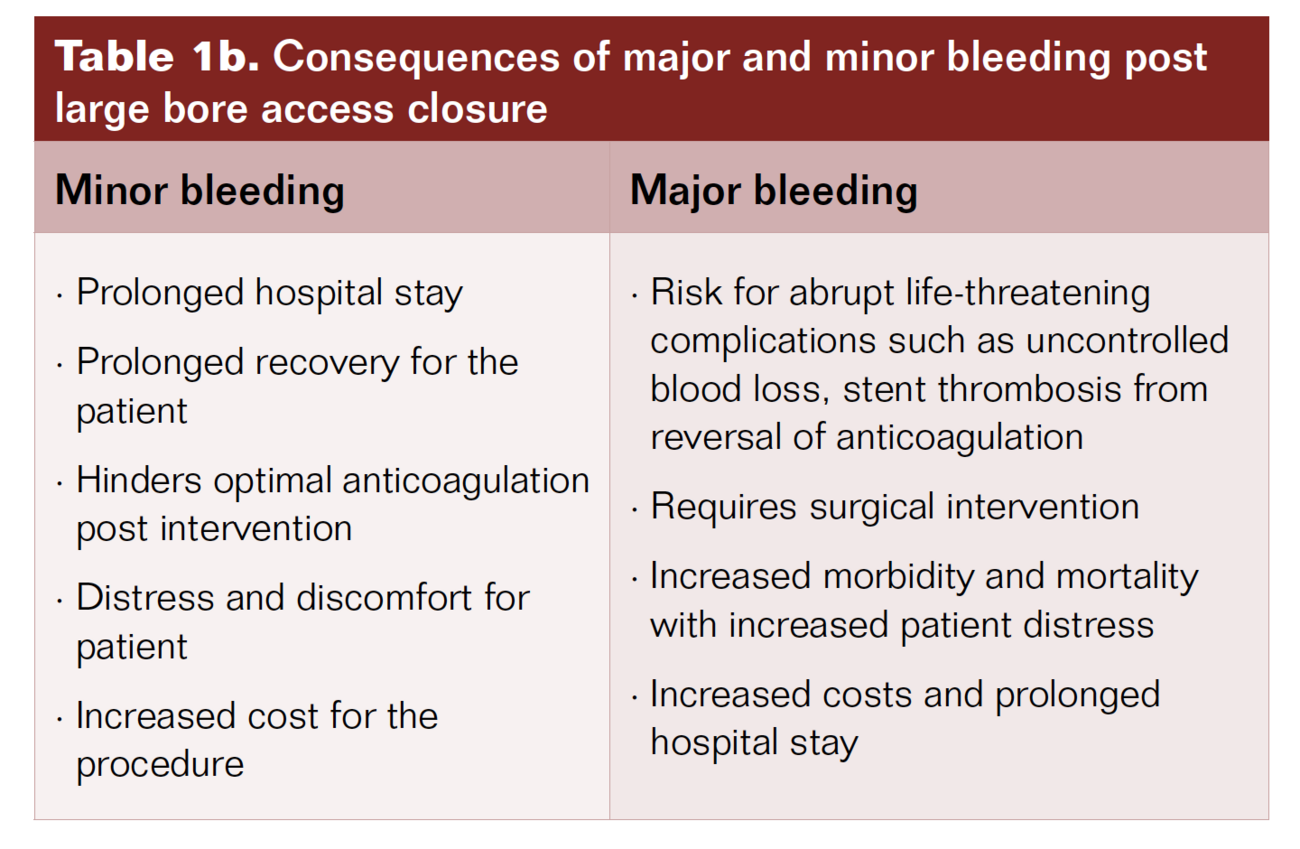Complications with large bore access are depicted in Table 1a.14 Of these complications, bleeding is the most common. Vascular bleeding complications can be categorized as major and minor.2 Several consequences of minor or major bleeding are listed in Table 1b.