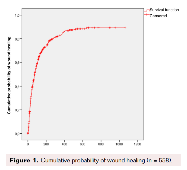 During the study period, 77.2% of the ulcers healed, with an average 84.6 ± 97.5 days until healing (Table 7). Figure 1 shows the function of cumulative healing probability of the ulcers. Healing of all limb ulcers was achieved in 64.3% of the 308 ulcerated limbs. Figure 2 shows the cumulative healing function of all limb ulcers.