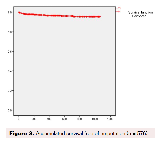 The mortality rate was 5.9% (17 patients) at 3 years of follow-up, which we consider low when compared with other studies, although our follow-up is shorter in duration.22 It is demonstrated that patients who undergo follow-up through the DFU improve morbidity rate and their life expectancy. In 2008, Young et al published the results of 5-year mortality in patients undergoing follow-up in a specialized DFU and cardiovascular risk control compared with patients with the same characteristics who did not undergo follow-up supervision in the DFU, obtaining a mortality rate of 27% and 48%, respectively.26