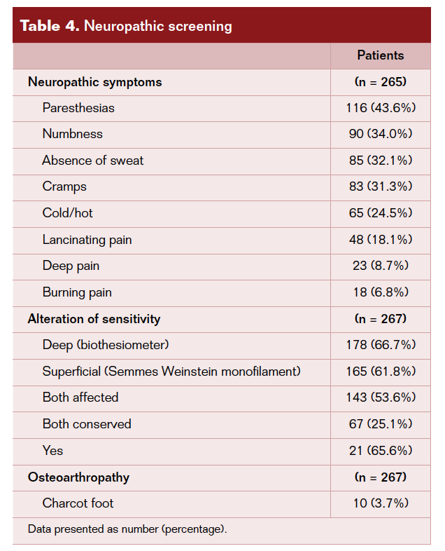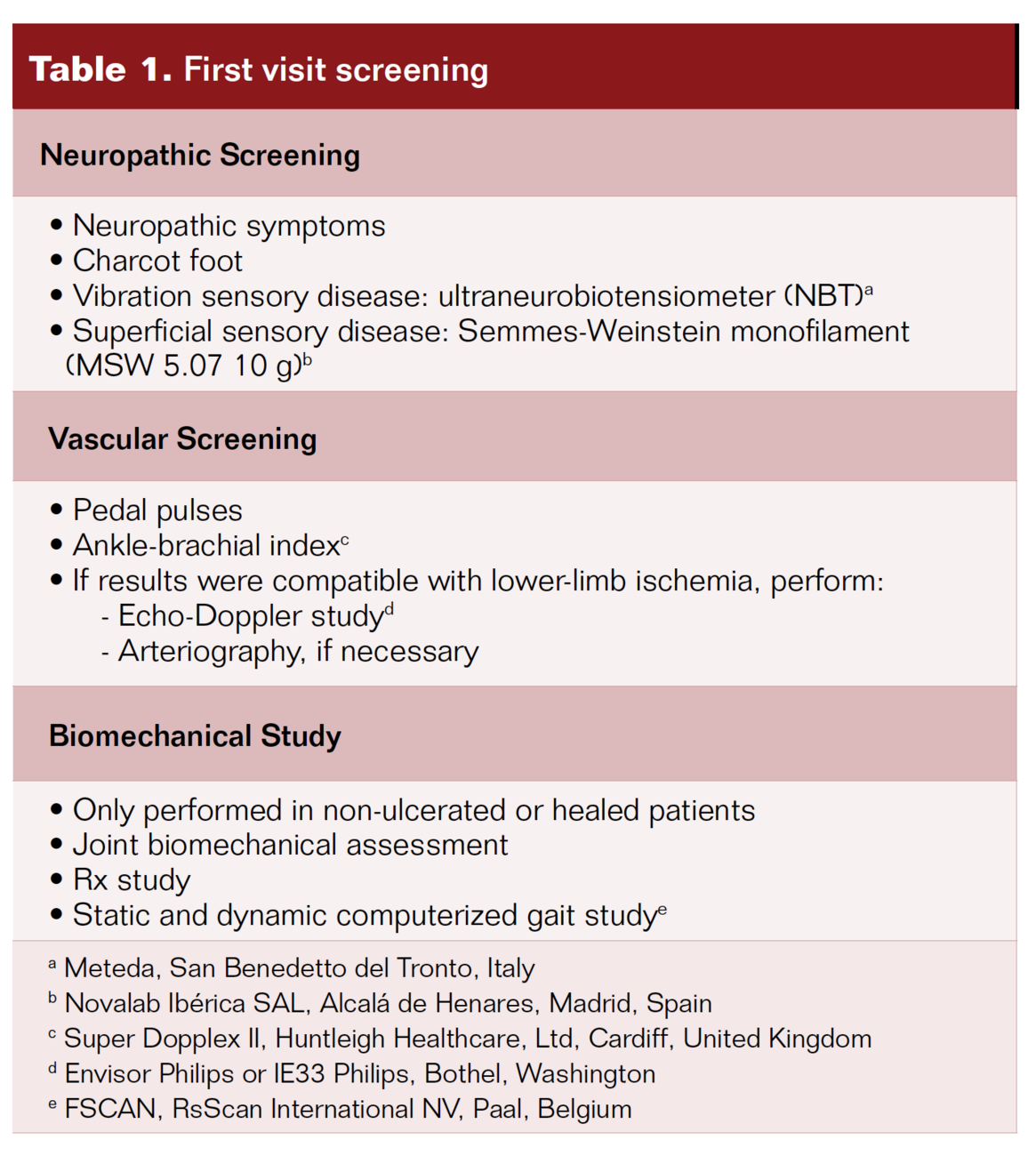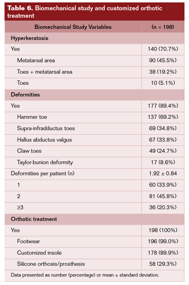 Neuropathic and vascular screening at first visit were performed in all patients. In non-ulcerated or healed patients, a complete biomechanical study was performed as well (Table 1).